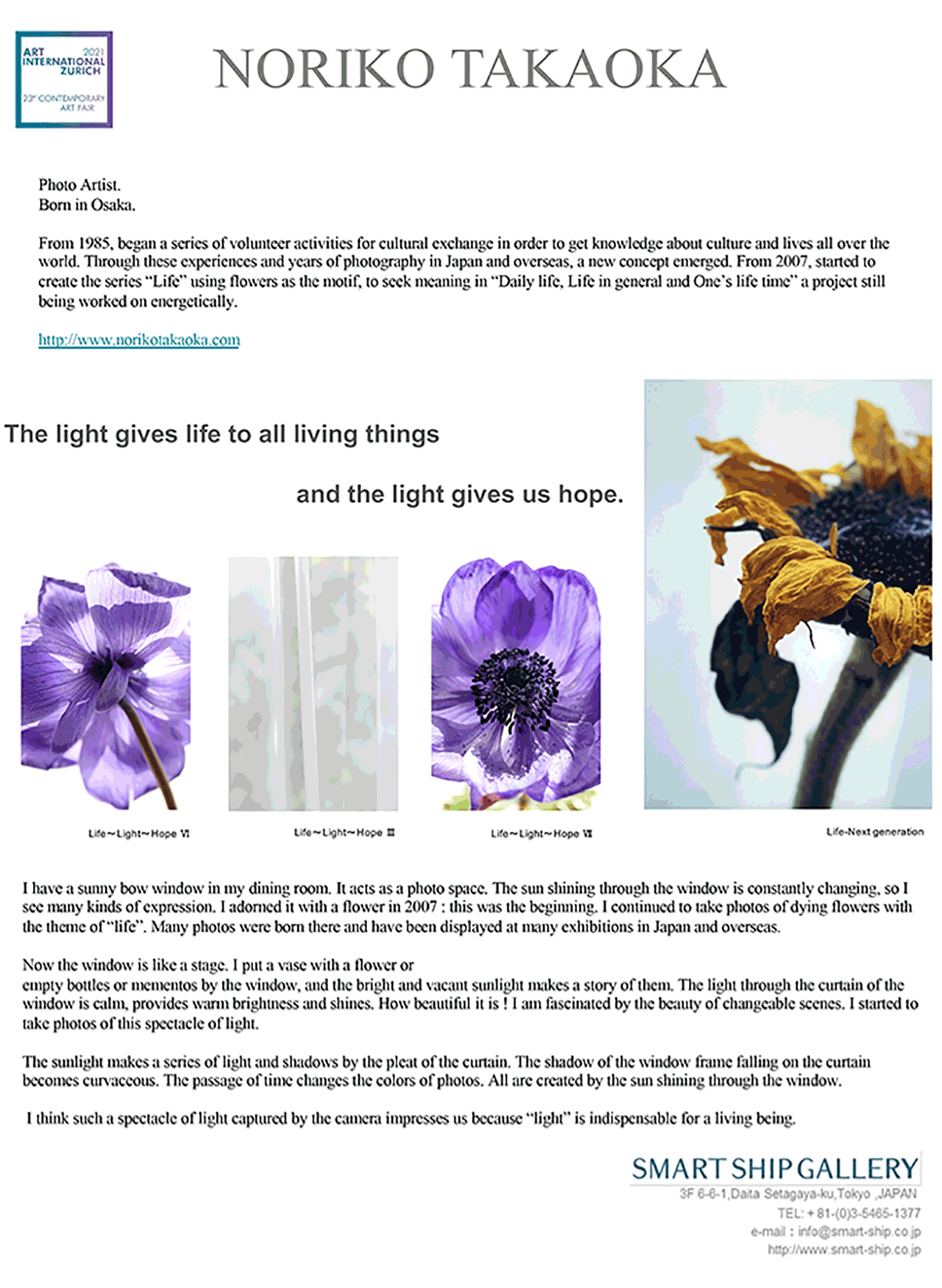 スイスのチューリッヒで毎年開催されているCONTEMPORARY ART FAIRに東京のスマートシップギャラリーから出品しました。5年ぶりのことです。作品は、枯れゆく花のシリーズ「Life」より【いのちの輝き】8点。